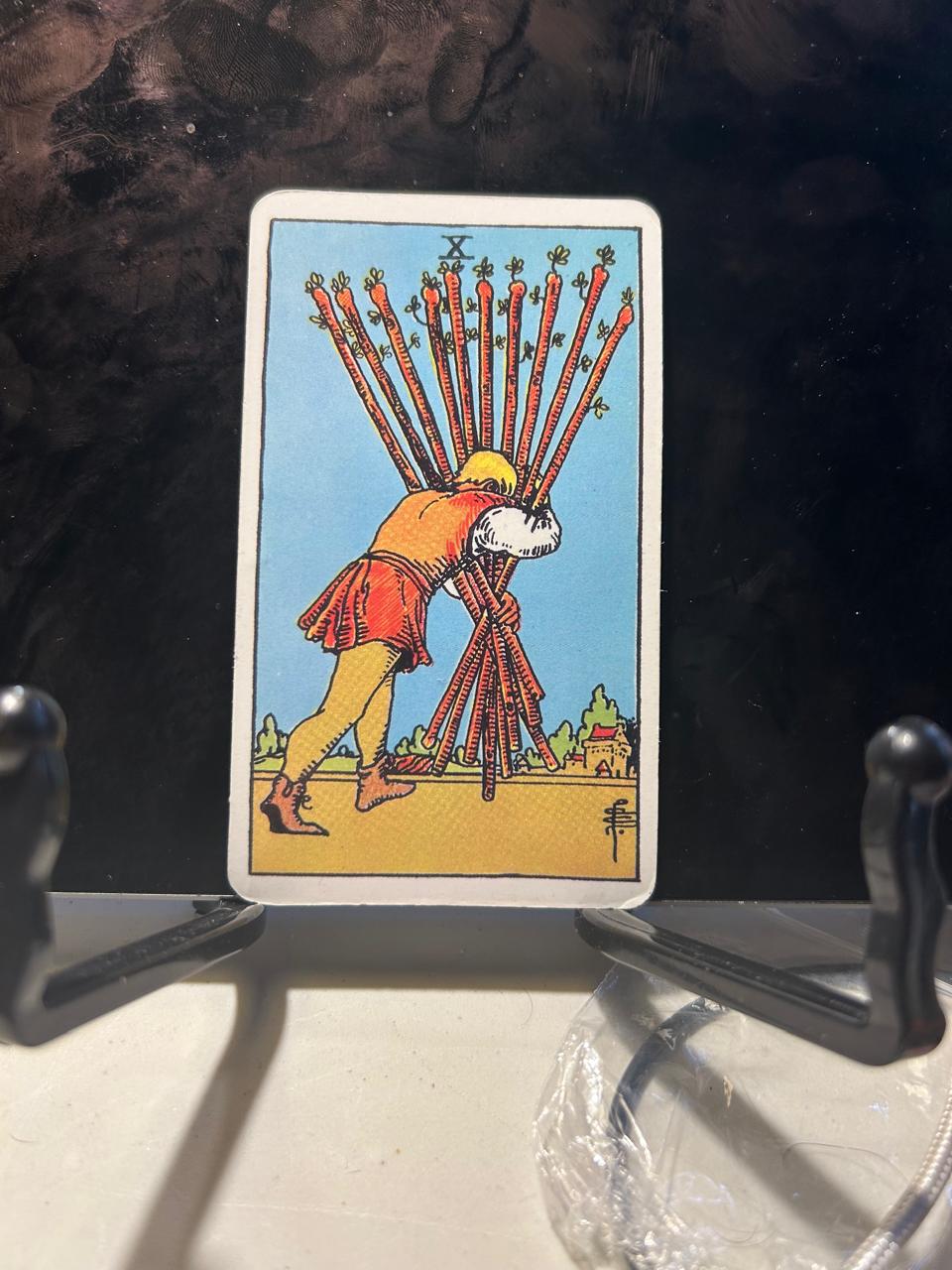 Mi primer paso, está representado por la carta de Tarot que ilustra este texto, el Diez de Bastos, la cual me muestra un personaje agobiado por el peso de sus propios miedos, inseguridades o por las consecuencias de sus decisiones.